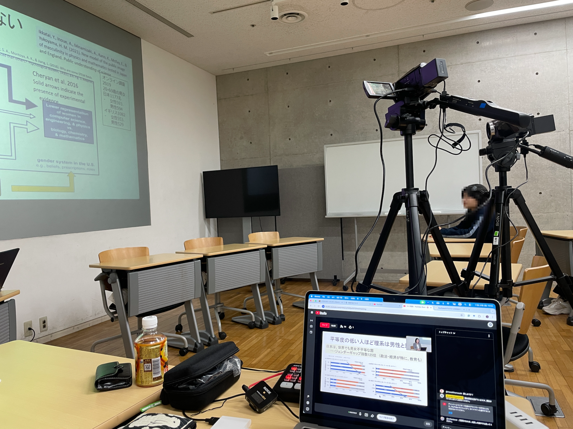 本イベントは、対面とオンライン配信を組み合わせたハイブリッド形式で実施され、オンライン配信にはメディアスタジオのビデオカメラやワイヤレスマイクなどの機材が使用されました。